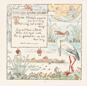 ব্যাঙেদের তো একটি সামষ্টিক অস্তিত্ব ছিলো। তারা একসঙ্গে বাস করত, একসঙ্গে ডাকত, আনন্দে ভরিয়ে রাখত তাদের পুকুর। কিন্তু তারপরও তাদের মনে হয়েছিল, এটা যথেষ্ট নয়। তাদের ধারণা ছিল যে কোনো সার্বভৌম শাসক ছাড়া, একজন যে তাদের ঐক্যের প্রতীক হবে—এমন কেউ ছাড়া, তারা অসম্পূর্ণ। তারা এমন একজনকে চেয়েছিল যে তাদের হয়ে তাদের (সকলের) প্রতিনিধিত্ব করবে।